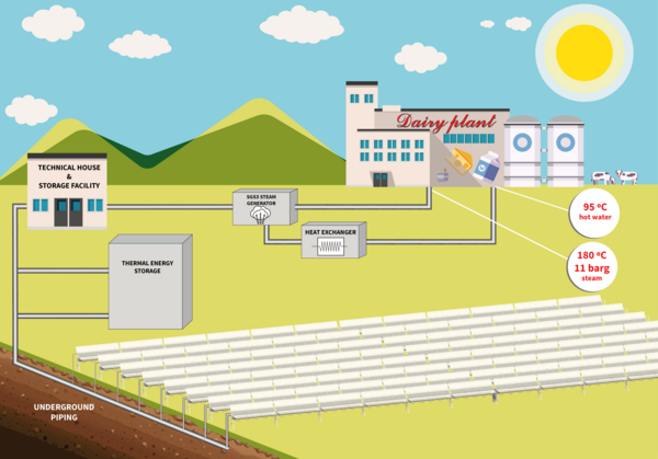 The CSP parabolic trough technology applies sun-tracking curved mirrors (called parabolic troughs) to maximize the sun’s energy and consequently the efficiency of heat production. The sun's rays are captured and reflected onto a receiver pipe filled with a heat transfer fluid (water or thermal oil) that is located in the central point of the troughs. Here, the concentration and a significant better utilization of the sun’s energy is obtained.